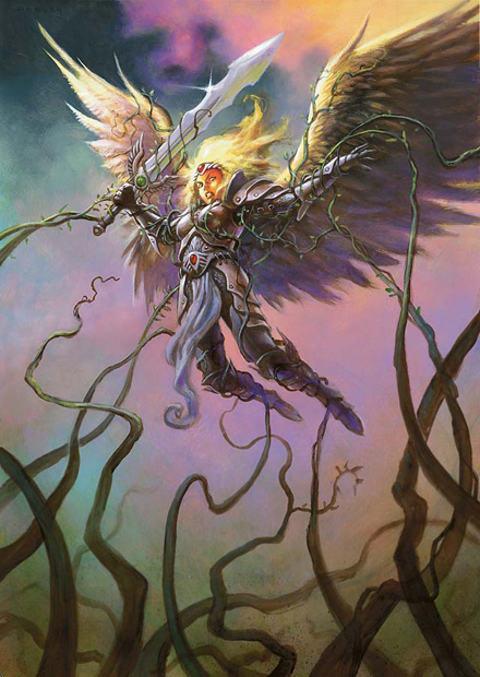 There are answers to flying creatures in the form of Spider Umbra and the M11 “preview card” Plummet, in addition to the Pale Recluse. But more than that, there’s some very solid spot removal in here as well. A single Path to Exile and a pair of Oblivion Rings– top-tier Standard cards all- give Green some very real answers to the customary problems of blockers and- yes- even enemy Planeswalkers.