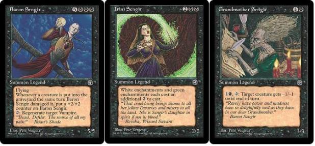 Although the cards themselves reveal only Legends, Oracle shows them properly errata’d to be a Vampire, Vampire Dwarf, and Human Wizard, respectively. Despite her suspect appearance, in the lore ‘Grandmother’ Sengir is a Bathorian mortal who sustains her unnatural lifespan through the fluids and essences of young women. Bon appetit!