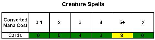 This is hard. I’ve decided to start with a basic deck framework of 24 Lands, leaving 36 open slots. I’d like the deck to be Creature-heavy, so let’s say we take between 20-24 Creatures. We’ll first begin by laying out all open candidates by converted mana cost, to get an idea of how the deck’s beaters will curve out.