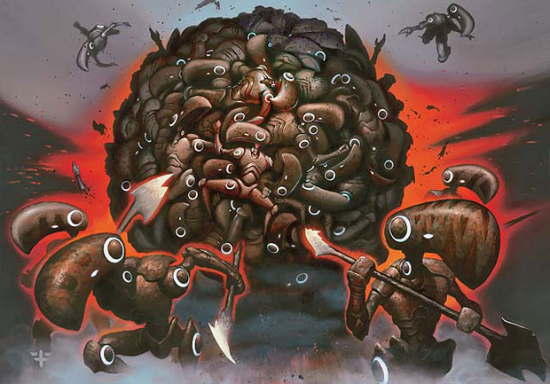 Welcome back to our first round of Scars of Mirrodin’s intro decks, beginning with the mono-White Myr of Mirrodin. Our initial impressions were that it was a welcome move in the direction of consistency, packing in multiples of a smaller number of cards rather than a long list of singletons, a drawback of some previous decks. Boasting a solid removal suite and combat tricks, the deck supports its Myr with a somewhat singleminded, focused approach that seeks to compensate for some of the flaws inherent in a Weenie/swarm strategy. To find out how it performs, Sam and I squared off, with Sam opting to pilot the Green/Red Relic Breaker. With her behind the most aggressively anti-Artifact deck in the set, I had my work cut out for me. Here’s how the games unfolded:
