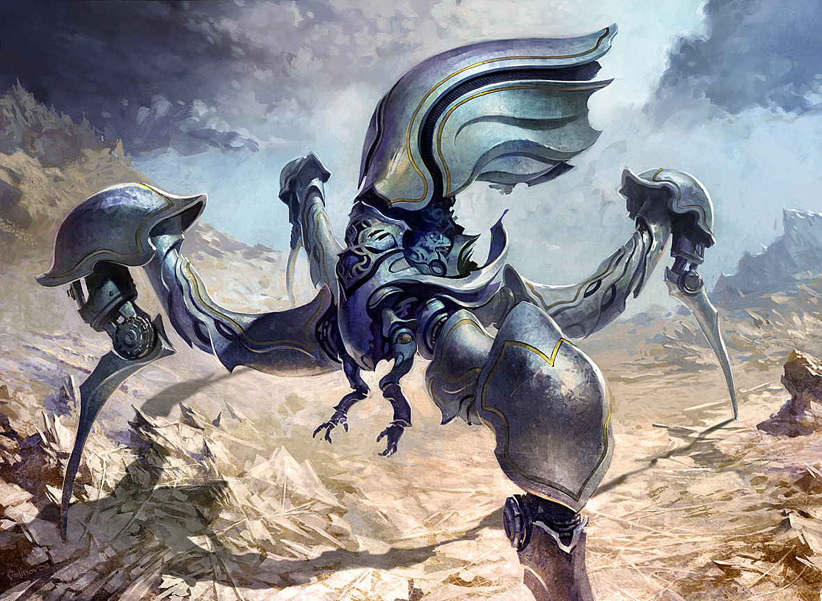 Another addition I’d like to suggest is adding the element of surprise by having the third artifact being one cast with flash ie in the middle of combat. Unfortunately there are little options given in the Scars set. So, if the playing environment allows for it, let’s get back to Mirrodin and add some of Chiss-Goria’s gear (Scale and Tooth) just to have the element of artifact combat tricks covered …