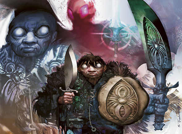 I don’t know who was more excited to roll up the sleeves and get down to playing- me with the new Fire & Lightning deck, filled with one of my favourite archetypes, and Sam with the five-colour critterfest Slivers. They seemed an enticing matchup, for the decks were not balanced against one another in design (the way, say, Duel Decks are) and anything could happen. In Phyrexia vs. The Coalition, Wizards similarly pitted a five-colour deck versus a mono one, and had to build in some restraints to the Phyrexia deck so that it didn’t just win almost every time (as you’d expect a Suicide Black to do).