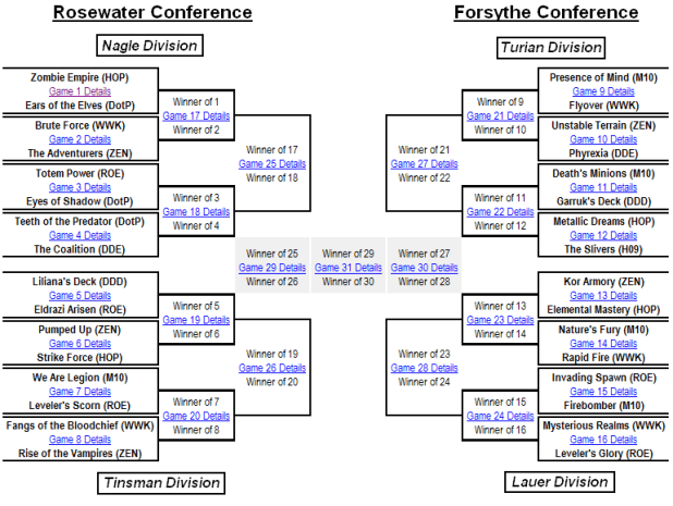 The Championship will be divided as follows. There are two Conferences, the Rosewater Conference and the Forsythe Conference. Each Conference is further divided into two divisions. In the Rosewater Conference, we have the Nagle and Tinsman Divisions. For the Forsythe Conference, you have the Turian and Lauer Divisions. Each deck’s name went into a hat, and they were pulled at random to seed each Division. Here’s a view of the brackets (click on the image to expand the size):