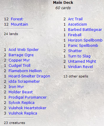 With all the burn, your critters should be able to get in after you clear them a path right up the middle, and you should be assured of finding a little extra reach later in the game. You’ll still be the terror of any artificer you come across, and shaving a few of the expensive cards gives you a more reliably fast start. And just to aid in the Green, we’ll skew the land to be 16 Green with 8 Red, which should be more than enough to let you reliably play most anything you draw when you need to.