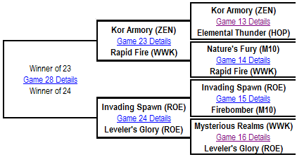 Here we are once again, sports fans around the world and of all ages, to see the remaining division in the Forsythe Conference be decided! It’s all come down to these four: Kor Armory (ZEN), Invading Spawn (ROE), Leveler’s Glory (ROE), and Rapid Fire (WWK). By the end of the day, only one shall remain to move on and challenge for the divisional banner and right to represent the Confereince in the finals!
