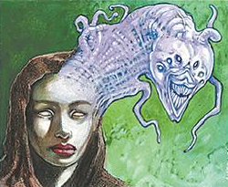 Now turn 5, Jimi counterattacks for 1 with one of the Elves, using the other to help squeeze out an Elvish Bard. We’re tied at 17 life apiece. I keep the Shaman at home, and add a Phyrexian War Beast to the ranks. I pay the mana cost foolishly, leaving a Swamp open rather than a Mountain, and can only kick myself when Jimi exploits my oversight by sending in the trio of elves. I’m exactly one point shy of being able to kill the Bard with the Beast and Shaman, so her two mana dorks get in for damage. I’m now at 15 life. She follows this up with a Yavimaya Ancient and passes. Back to me, I add to my forces with an Abyssal Specter.