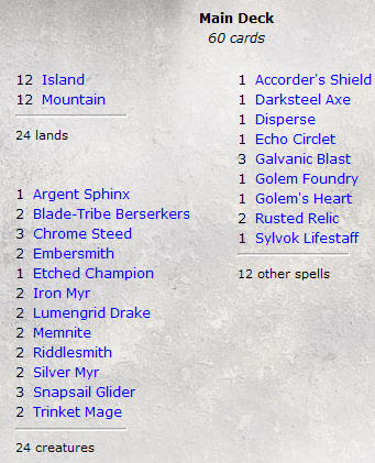 Our final decklist can be found here. Metalcraft began as a solid showcase of the mechanic, but with perhaps a bit too much variance and too little focus. We’ve removed fringe-player cards from the decklist, and strengthened its spine down the middle. What Metalcraft most wants to do is get an initial rush of early plays to turn the mechanic ‘on,’ then capitalise on it by playing creatures that deliver more bang for the buck. Get out your Axes, Memnites, Spellbombs, and other cheapie artifacts as soon as you can. Once you’ve put yourself in good shape, start bringing out your Rusted Relics, Chrome Steeds, and the Argent Sphinx if you’re lucky enough to draw it. Use Galvanic Blasts to clear the lanes to get in for damage, and to finish off your opponent if they fall wwithin burn range. Finally, if you draw into the countermagic, hang onto it- the best games are those where you never need it, but if you throw it away on something trifling you’ll cry next round when the Sunblast Angel touches down and wipes your board. Once you counter your first spell, your opponent will be awake to its presence- try to bluff it at all times if you can. With so many of your cards needing only colourless mana, always keep Islands open whenever feasible… and a single Mountain for the Galvanic Blast.
