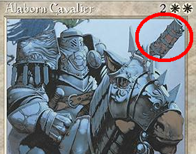Heading towards the top of the curve, the stream of Knights begins to taper off. There’s another flyer in the Skyhunter Patrol, another leveler with the Kabira Vindicator (who pumps your entire army), the double-strike-granting Kinsbaile Cavalier, and something of a historical anomoly in the Alaborn Cavalier. Neither the Cavalier’s body (the customary 2/2) nor his ability (tap when attacking) make him all that unique. Instead, he represents a time and a place that Wizards has advised they likely won’t be returning to again. Here’s a hint- take a look at his armament: