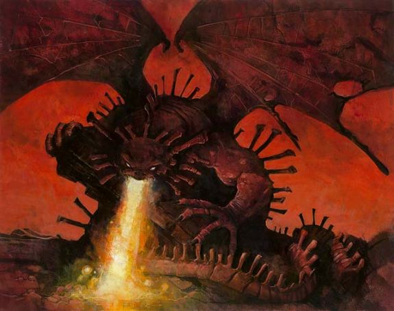 Then Legion lands the Stormcaller’s Boon (cascading into an Aven Mimeomancer). The Boon gets popped the next turn and Jace takes a drubbing, down to less than half life. With many of his creatures defensive in nature (two Walls of Deceit being the most obvious example), Jace can’t counterstrike without leaving himself open for defeat, and looks to circle the wagons. The irritating Mimeomancer gets solved with a Fledgling Mawcor clearing the way for the Quicksilver Dragon kept on reserve in Jace’s hand. A pair of Mulldrifters refill his hand, and a Spire Golem lands for more power in the air