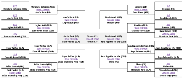 The Duel Decks- always a favourite thanks to a rare-heavy and focused construction- gave a good accounting of itself. Jace’s Deck is now in the Final Four, while Chandra quashed Naya Domain on her way to an upset by Rumbler. Demonic fell in its first matchup, but Divine surprised some by strongly contending until it, too, fell to Jund Appetite for War. At every point, they’ve been a force to be reckoned with, and now one of them stands on the verge of winning it all today.