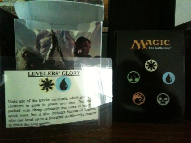 Each deck is sleeved in the UltraPro 5-mana sleeves and stored in the corresponding UltraPro deck box for each particular set. Here you see a Rise of the Eldrazi deck. Additionally, a laminated card is inserted into each box denoting the deck’s name, colours, and a verbatim transcript of the blurb found on the back of the box. For sets where no such deck box was released, we use a flat black UltraPro box instead.