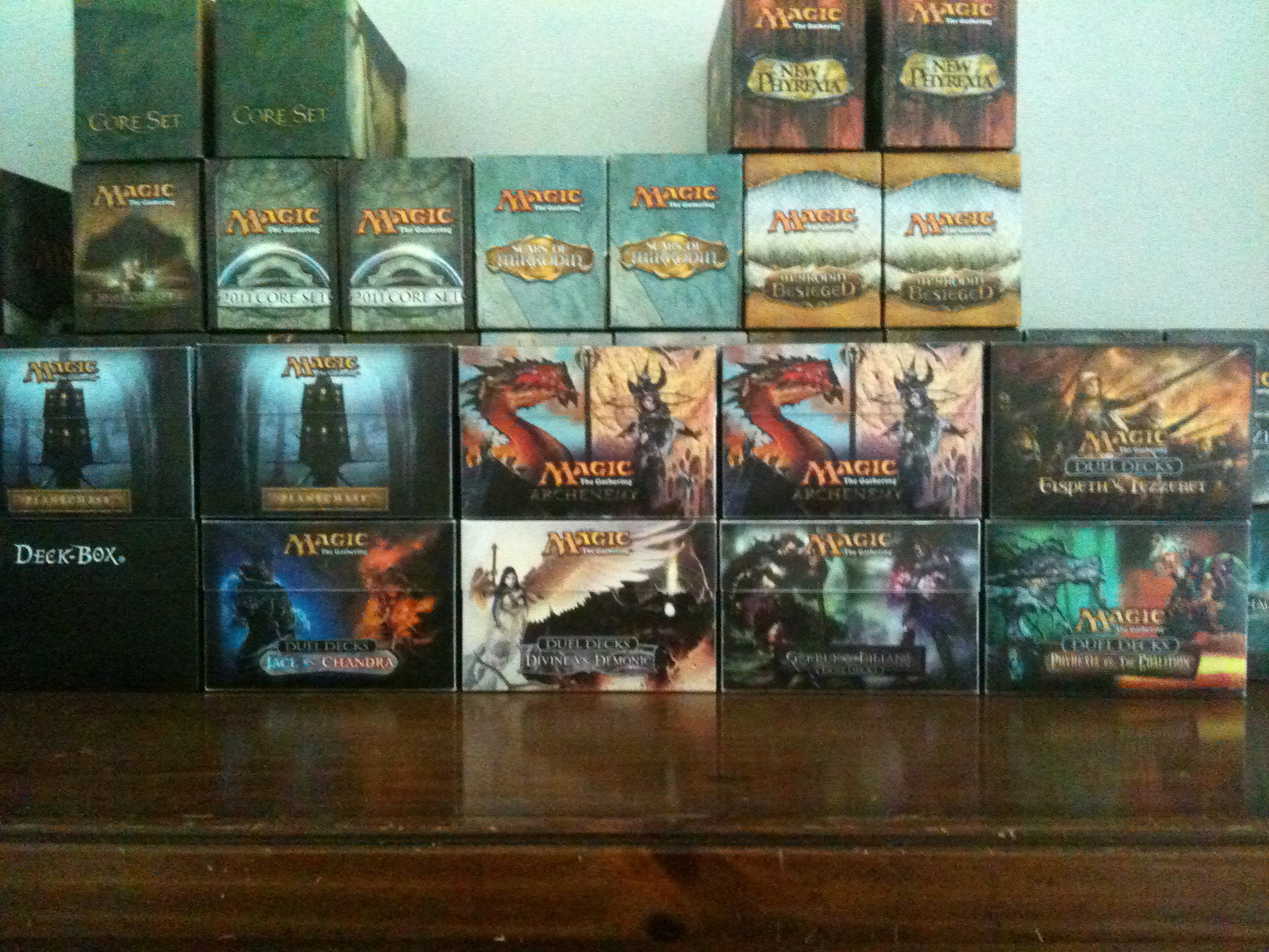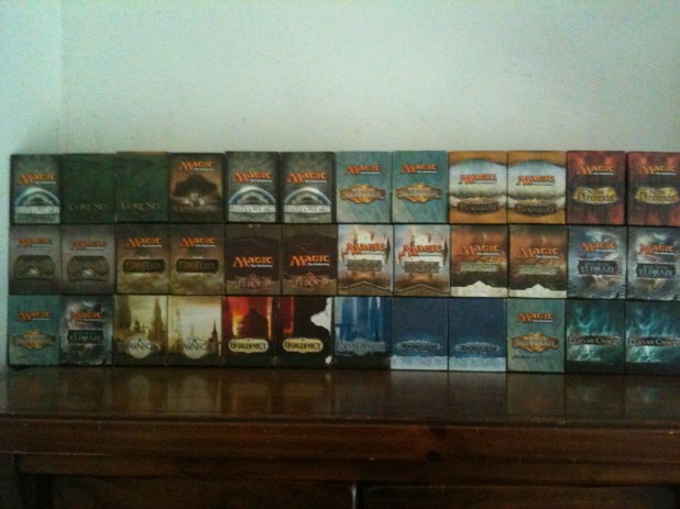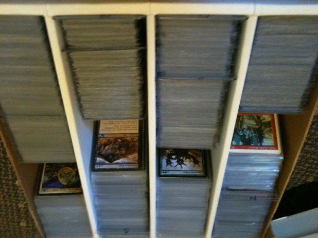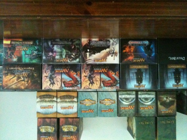 Wow, I wish I had that much awesome space. Normally I just pull them out and stick them in binders. That looks way better though. Too bad the Commander decks are too small in their boxes, and too big with sleeves…
