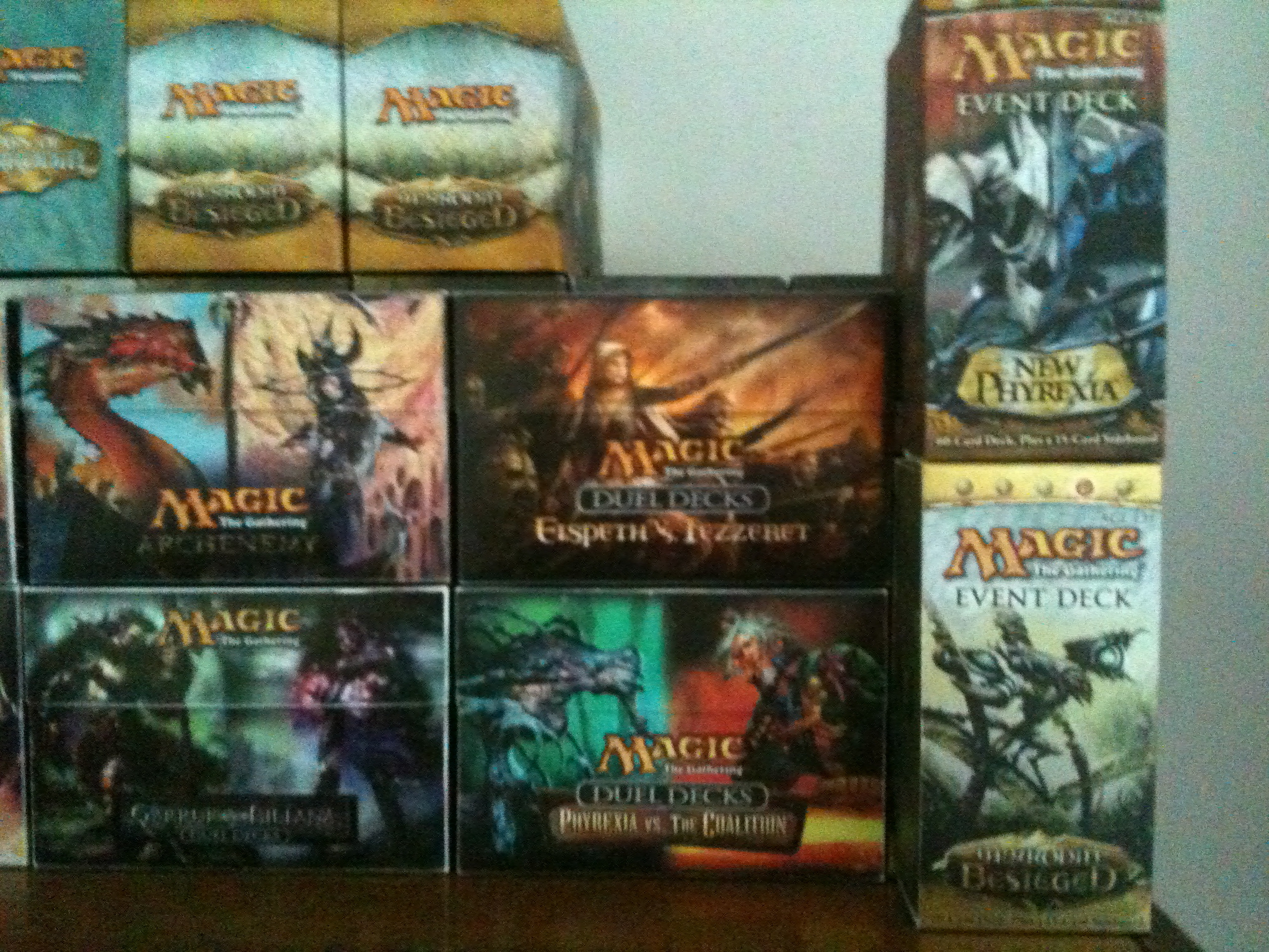 Beseiged was the first set I purchased all of the decks, and for New Phyrexia I simply assembled them out of singles; I have been storing them in the deck boxes that come in the fat packs, but I much prefer sleeves. That said, I will be using different colored sleeves for different decks.