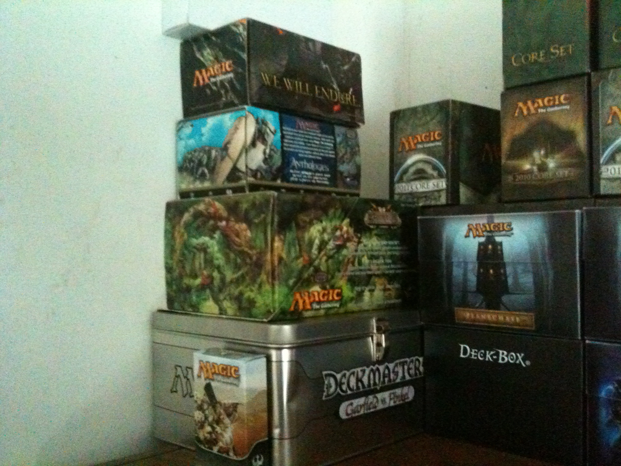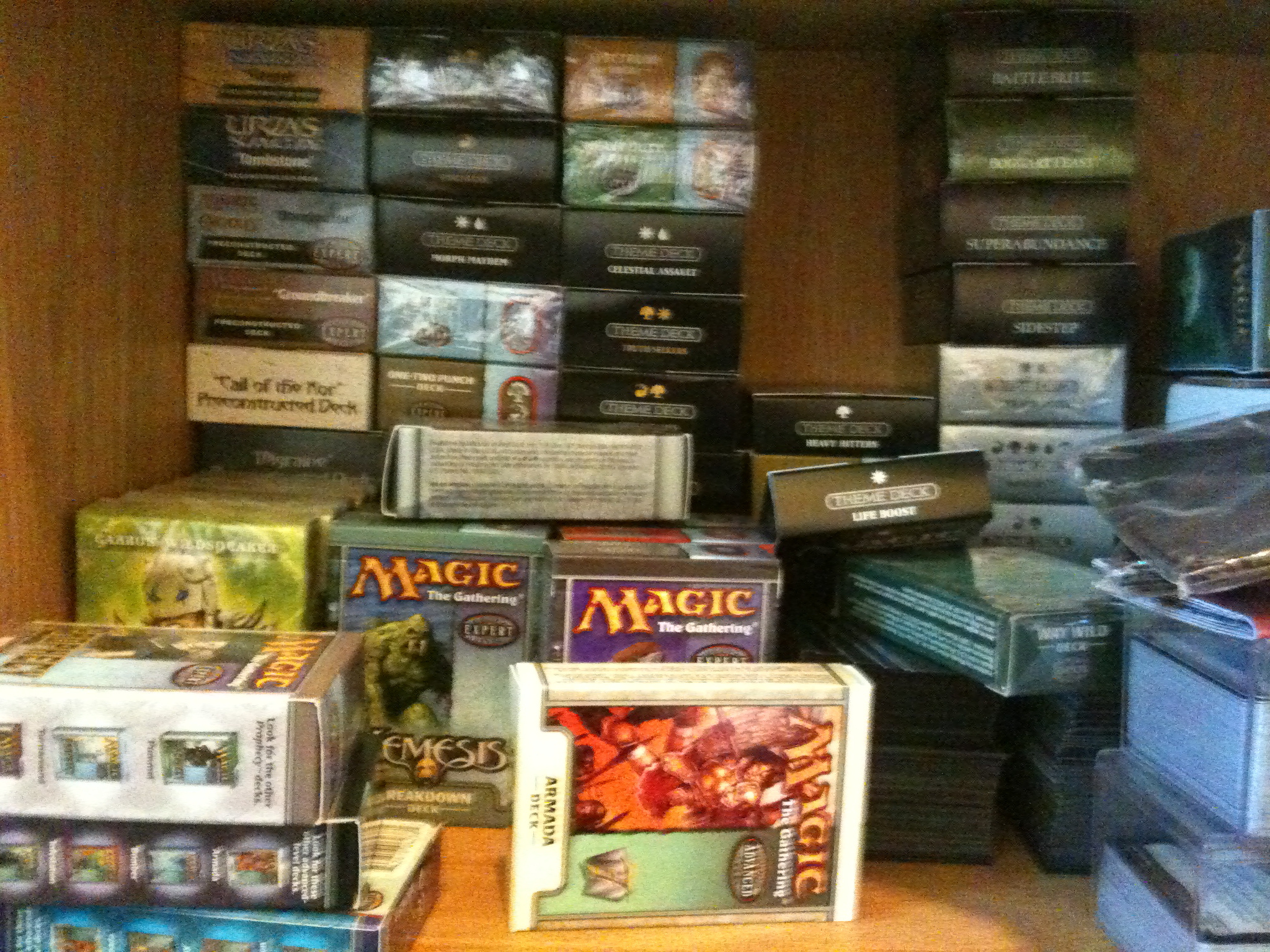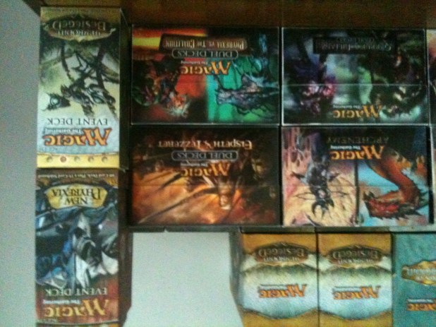 From time to time, readers of Ertai’s Lament have asked us to post some pictures of our precon collection. Knee-deep in spring cleaning today, it seemed the perfect time. For the curious, here is our collection and how it’s stored. We like to think of it as a library of precons. Here’s a brief tour.