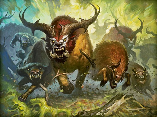 As we approach the top of the curve, we begin to get a nice, diverse selection of fat beaters. There is a pair of Stampeding Rhinos, back from Magic 2010. Twin Acidic Slimes give you some targeted removal upon entering the battlefield, but the prohibition against picking off a creature restricts their utility somewhat. A pair of Stingerfling Spiders also give you a two-for-one, this time against one of Green’s classical nemeses: flyers. Then there’s the vanilla Vastwood Gorger, the aforementioned Arachnus Spinner, and a Garruk’s Horde. The Horde shows just how much you get for your mana these days when it comes to creatures- directly on-curve as a 7/7 for seven mana, not only is there no drawback (aside from your opponent always knowing what you’re drawing) but you get the potential for added card advantage.