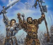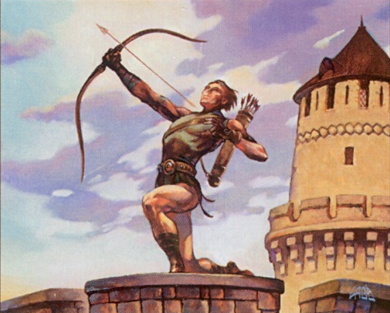 Aggression: The curve begins with a pair of otherwise unremarkable 1/1’s, the Eager Cadets. Against slower decks you might get in a couple shots with them, but they’re otherwise about as useless as they sound. Next on the curve are pair of Knight Errants, 2/2’s for two mana- and nothing else. Much more sexy are the Longbow Archers, for while they share the same concerted mana cost as the Knights, they have first strike and reach. The first strike in particular is about as good as it gets in this army- with power-pumping effects from the supporting cast, they may well stick around for quite awhile when their less stout brethren have perished.