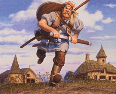 Jimi’s turn-2 Goblin Glider is the opening play of the game, but my immediate answer is just as good- Longbow Archer. Next turn Jimi lands a Goblin Chariot, but the threat of the Archer keeps it at home. I add to my defensive position with Standing Troops and pass.