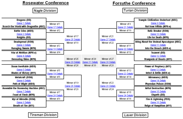 A few days before each Championship article, we’ll post the upcoming matchups and call for predictions for each match. Each person that participates will get 1 point for each match they correctly predict the winner of. Points will be earned for the duration of the event, and the reader with the most correct picks (most points) at the end of the Championship will win two Intro Packs, one from M12 (the appropriately-named Grab for Power) and one from Innistrad (to be determined)! We’ll keep track of the points, and routinely post them for everyone to see on a ‘leaderboard.’ In the event of a tie (two or more readers with the same amount of points), the winner will be determined at random.