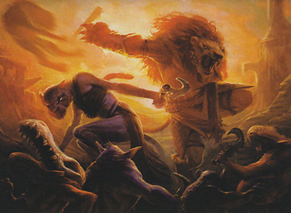 And as we focused on the weaknesses of both decks in that previous writeup, so we’ll focus on the elements of gameplay present in both decks that make them successful. In each deck analysis, we broke out each deck into the broad categories of strategy that each seem to employ. For Nicol Bolas, these were threat mitigation/stalling and discard. For Ajani, there’s a rather intricate lifegainer synergy that links a number of the cards. In both cases, the decks are well-designed to support them, and the diversity of cards (both decks approach highlander status) means that while the gameplay will widely vary game to game, the decks will still retain the same ‘feel’ throughout.