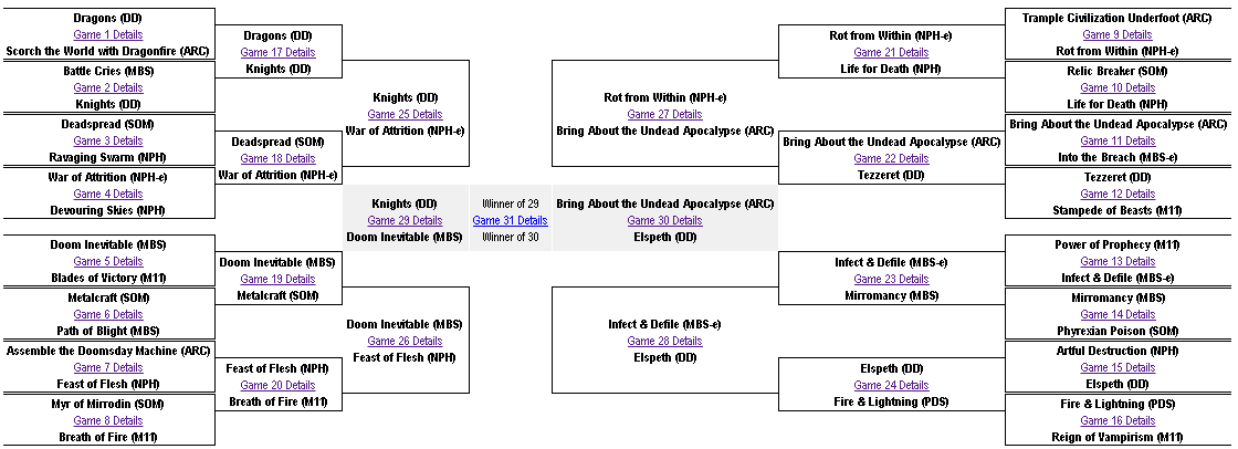Welcome to the final installment of the 2010-2011 Preconstructed Deck Championships! It’s been a heckuva ride this far, with a full field of 32 decks at the outset now whittled down to a Final Four. Most remarkable was the resurgence of the Duel Decks. From their strong showing in the 2009-10 season, they fell far short of expectations in the following 2008-09. This time they came back with a vengeance, and now we have the exciting prospect of an all-Duel Deck finals between Knights and Elspeth. On the other hand, Archenemy would like nothing more than to smash Elspeth beneath a horde of reanimated undead, as Bring About the Undead Apocalypse stakes its claim to the title. And of course this season’s feel-good Cinderella Story torch is carried by Mirrodin Besieged’s Doom Inevitable. Usually the regular Intro Pack decks have solid representation in the finals, but this time there’s only the one.