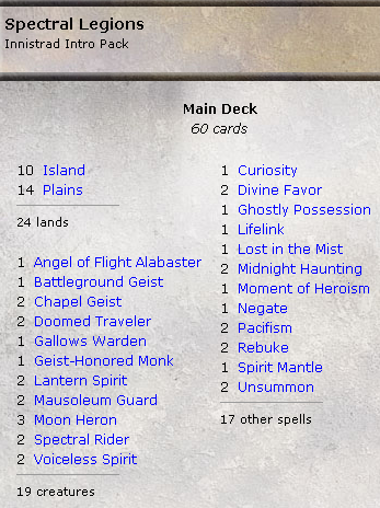 Welcome to the first Whispers of the Muse piece for Innistrad. This week we’ve received not one, but two requests for a second look at Spectral Legions, the Blue/White ‘skies’ deck featuring some of the many Spirit-centered cards on offer. Let’s see what they had to say. Our first letter comes from Bradley B, who had the following to say: