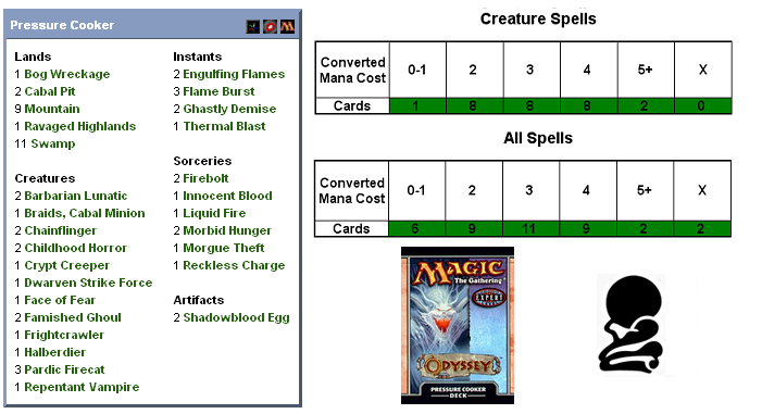 Of course, Feast of Flesh is not the first such deck to hew to this strategy, but rather merely the latest example. Today we’ll be looking at Odyseey’s take on the archetype, the Black/Red Pressure Cooker. Pressure Cooker has the following tactical ambition. First, you get out some early threats and beaters, and begin damaging your opponent. When the red zone begins to get too congested, you start ladling out the removal to clear a path for your creatures. Between your inevitable combat casualties and the removal you’re dispensing, you should hit threshold realitvely soon, allowing a number of your creatures to ‘power up’ and become stronger. Then use your remaining removal to clear a path, drop some heavier creatures, and mop up your opponent. We’ll examine how the deck performs at each stage of this strategy, but let’s begin with the mana curves to give us some points of reference.