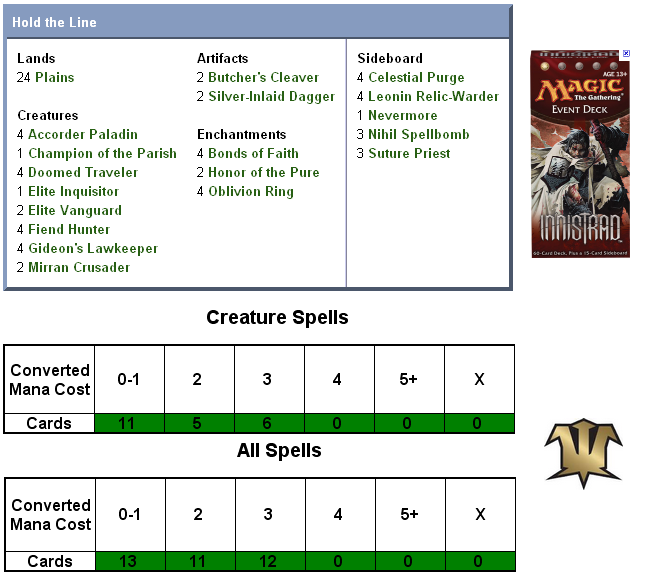 With cards like Crusade and White Knight, the idea of a mono-White aggro deck surely had its genesis in the earliest days of the game, and it has proven to be one of Magic’s enduring archetypes. For the second time in their brief history, we find ourselves in possession of a White Weenie Event Deck, Innistrad’s Hold the Line. The previous deck, War of Attrition, was released for New Phyrexia and featured the Stoneforge Mystic. Her banning made the release of the Event Deck a bit awkard, as these decks are designed for organised, competitive play, but Wizards concocted a rather elegant solution. The Mystic would be playable, but only if someone was using the exact War of Attrition deck. While we have no such worries this time around, what we do have is a deck that seems to be even more aggressively constructed than the last!