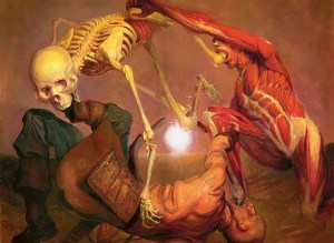 Although the final results give a picture of dominance, that each game ended with me at single-digit life gives an encouraging sign that these decks are well-balanced against one another. Still, Grixis Shambling Undead consistently provided me with options to do exactly what I wanted to do. Its solid removal suite game me some options to clear out enemy creatures as needed, such as when I set up a back-breaking Elder Mastery strike by picking off Jimi’s hangback Hawk. And its creatures are themselves somewhat resilient to removal given the presence of the unearth mechanic. Although aura-based removal like Pacifism still has full effectiveness, burn and kill spells can’t stop the newly-smited critter from making a one-turn comeback. It also lets me be a little more loose in combat, increasing the margin I get on trading creatures in the red zone. Mine will come back- hers won’t.