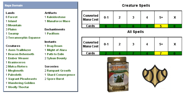 To begin with, unlike the other decks of Shards and Alara and Conflux,Ā Naya Domain does not include the uncommon three-colour nonbasic land of the shard, in this case Jungle Shrine. Instead, it trades the Shrine in for something much more useful here- a third Terramorphic Expanse, a perfect method to fetch whatever land you happen to be missing. You also have a total of six other cards in the deck that will help round out your mana base.