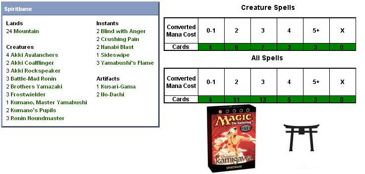 I got this deck when it came out and was quite disappointed…the only cards from it I liked were Kumano and the Akki Coal-Flingers. Overcosting for yamabushi is even worse than overcosting for soulshift. But that was mainly because I had no opponents using spirit decks. Should be better against an all-Kamigawa line-up.