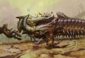 My minion leaped into battle, screeching and raked at my opponent feebly, once, then twice. Suddenly, I recognized his ploy as a massive portal appeared through which I caught only the briefest glimpse of a terrifying monster before he cast it to its death. I grimaced, when in the next moment, that screeching, hulking thing made of metal and poison came rising from the ground. I had passed it just briefly in another plane; it was a master of the mind, both creator and destroyer. At the side of my enemy, it filled him with endless possibilities, while mine could see only one. Death. For the briefest of seconds, I thought I could end this mind siege as I brought forth my own but my mind crashed into a wall of pure, impenetrable will that I could not overcome. I stumbled backwards, falling hand and foot into a mire so thick and suffocating that my thoughts left me. My foe understood the risks he took; he and I were drawing from the same well-spring of foul, death-fed, energy and so he sacrificed some of his very soul to call forth yet another fell creature. This monstrosity muttered mindless whispers as tormented and twisted as its own body and my companion slew itself at its mad suggestion. Under an onslaught of warped words and twisted metal, I fell into nothing.
