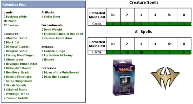 Don’t let the presence of Blue fool you- Relentless Dead is about as straightforward a beats deck as you’ll find outside of Green. Made up of the fairly standard ratio of 24 creatures/12 noncreatures, it boasts an unusually aggressive curve more in keeping with the concept of an aggressive Zombie. At long last, the humble Scathe Zombies have been rendered obsolete by a strictly-better update, and the oft-seen Zombie of old- carrying a useful ability but often a bit pricey on the mana- has been updated to a much more aggressive Skaab mechanic of getting more for less so long as you can exile a creature card from your graveyard. Relentless Dead, then, will look to do two things- find ways to make sure there are creatures in its graveyard, and put a lot of bodies into play.