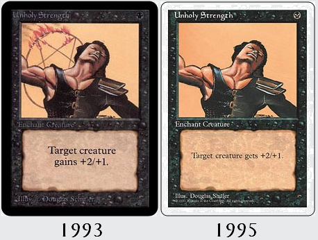When Magic: the Gathering came along in 1993, the currents of the controversy were still apparent. As Dungeons & Dragons had before it, Magic started out very small and with an uncertain future. It is perhaps not surprising that Wizards of the Coast might have felt itself ‘under the radar,’ as it had a few cards which embraced occult imagery and nomenclature. Cards like Demonic Tutor, Lord of the Pit, and Sacrifice all trespassed into questionable waters, while the most renowned example of this undoubtedly was Unholy Strength.  As the game was exploding in popularity, it didn’t take Wizards very long to get a feel for the prevailing winds and begin to sanitise the game. Within a couple years, such iconography had been more or less scrubbed away.
