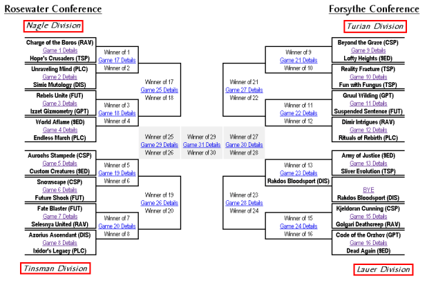 The 2005-07 season was a busy one for popular sets. Sure to excite are the ten decks from Ravnica block. That’s right, the guilds are going to war! They’ll be facing some stiff competition along the way. Although no premium products were released during this time (ir Duel Decks, Event Decks, etc), they’ll be facing down the ranks of Time Spiral block. If that wasn’t enough, we’ll even have the decks of Coldsnap and Ninth Edition mixing it up and looking for their shot at glory. We’ve randomly seeded all of the decks (including one bye), and here’s how this season’s battles will be shaping up.