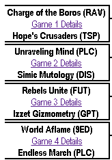 All posted predictions up until the moment the Nagle Division’s first round matches are posted (this Sunday) will be accepted. So pull out the racing forms, sharpen those pencils, and let us know in the comments which decks will win in these first four matchups. Good luck!