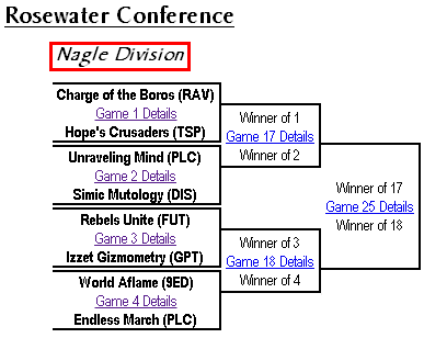 With the first four matches decided, we have cut the field by half. Only four decks remain to content for the honour of representing the Nagle in the semifinals, and they’re off to tend to their wounds and mull over the day’s battles. We’ll be back next week to determine a Divisional winner! Until then, look for the next predictions thread in a few days’ time. See you then!