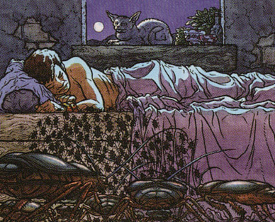 Down to 12 life, my turn 6 is a lamentable blank, though I do manage another Swamp. Jimi decides to send in only her enchanted Knight this time, as I’ve held back my Shade but can’t profitably block the bigger Knight with it due to a lack of enough Swamps. Back to me, I pick off Jimi’s Healer with a Funeral Charm, the play a Brood of Cockroaches. Next I pick off her unenchanted Knight with a Nekrataal, and as my turn is up Jimi taps out to add a pressure counter to her Magma Mine. For her part, Jimi attacks for another 3, forcing me to chump with my Brood of Cockroaches. They come back to hand at the end of turn, and I go down to 8 life.