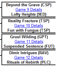 Traditionally it is here that we’ve given a deck-by-deck breakdown of the division, but this time we’ve made a chance and are presenting that analysis in the mid-week Prediction League update post. Our first match pits another of Ninth Edition’s 40-card mono-colour decks against a known powerhouse of Coldsnap, the death-trigger-filled Beyond the Grave. Next in a fratricidal clash of Time Spiral decks, we’ll see if the Saproling and Thallid armies will have what is needed to stand up to the currents of time itself when Reality Fracture takes the field. Our third feature match finds our first Ravnican guild of the day, the Gruul, as they try and use blunt force to get past the very delicately-tuned instruments of Suspended Sentence. Finally, in one of this season’s most unfortunate draws, the mill-reliant Dimir Intrigues faces down a deck that loves to see a full graveyard, the reanimating Rituals of Rebirth.
