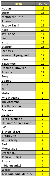 Through it all, our Prediction League has keep right in the hunt, and to the end it looks like we’ve got a race on our hands! The predictors cleaned up this past week, and we saw a surge at the top of the table. Although gobias holds the lead, perfect guesses last week from stric9tenthtechpriest, and Athena have all seen them gain ground. Here’s the table as it stands: