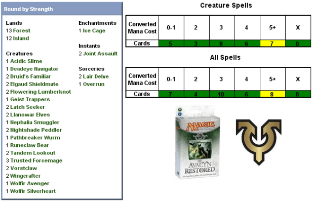 As we noted above, the noncreature support complement here is quite minuscule, but it at least tries to hit the familiar notes. You have your dose of combat trickery in a pair of Joint Assaults, a Giant Growth variant custom-tailored to take full advantage of soulbond. Removal comes in the shape of an Ice Cage, which is fairly poor as far as removal goes but about as good as you’re going to get. You get the opportunity for card drawing in a pair of Lair Delves, which are a perfect fit in this deck thanks to the unlikelihood of hitting a non-creature/non-land card. Lastly- and critically- you have access to an Overrun. With as many troops as you’ll be able to play onto the field with Bound by Strength, you should have little trouble winning most games you’re able to resolve this spell in.
