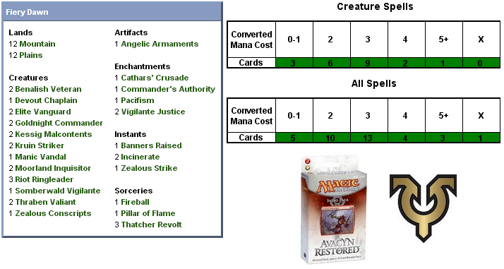 Easily the most outright-aggressive deck of the five, Fiery Dawn looks to live up to its name with a host of smaller creatures that interact with one another to let them punch above their weight. Our experiences with Avacyn Restored have shown it to be a slower, more deliberate environment, so in some ways this deck will look to be the proverbial bull in the china shop.