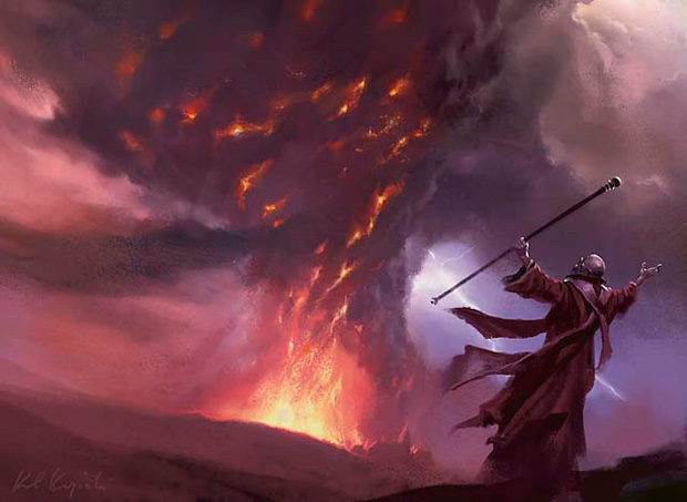 We’ve remarked many times on the particular charm of a feast/famine deck, one that is absolutely bonkers when everything lines up but can be frustrating to play when they don’t. Fiery Dawn is certainly such a deck. It’s a solid enough tribal humans deck, though its heaviness at the three-drop slot gives fair warning as to what’s in store. It’s certainly helpful to compare it to its other in-block tribal counterparts, Innistrad’s Repel the Dark and the Event Deck Hold the Line. Both were more aggressively-costed, with Repel the Dark running an opening curve (1, 2, and 3 CMC creatures) of 5-9-6 and Hold the Line boasting a blitzkrieg at 11-5-6. Compare this with the upwards slope of Fiery Dawn, 3-6-9, and it becomes clear that “fiery” is what the deck is capable of being, but not what you’re necessarily going to see.