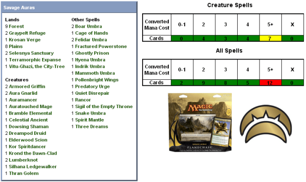 The first deck of the four, Savage Auras, returns to one of Wizards’ familiar objectives, which is making creature auras playable. Although notorious for leaving a player susceptible to getting two-for-one’d, Wizards is unwilling to give up the ghost on the concept altogether. From time to time, we see the results of that in precons such as 9th Edition’s Custom Creatures and Rise of the Eldrazi’s Totem Power. Today’s deck is the latest incarnation.