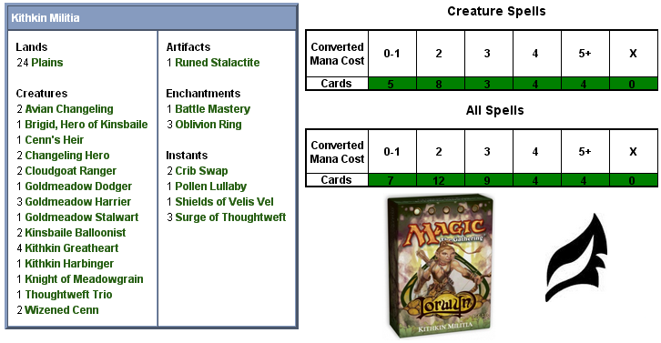 And so we find the latest collection of sisxty cards, Kithkin Militia. At its heart a White-weenie deck, Kithkin Militia shares a number of common components with that archetype. It has a relatively low mana curve that peaks at the two-drop slot, though like all of Lorwyn’s decks it is built more for endurance than speed. We also find a robust suite of combat tricks as well as equipment, though the latter is in unusually short supply here (though it does fill a very important role in the deck).