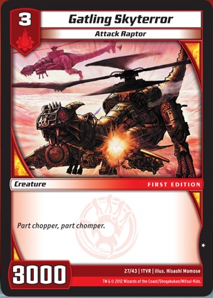 In Kaijudo, spells and creatures also have a colour, but you only ever need one of that colour to cast it. Let’s bring out an example, the mighty Gatling Skyterror.
