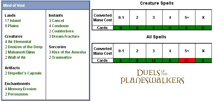 The creature complement of Mind of Void is both stripped down to the barest of essentials, as well as being highly focused. A pair of Walls of Air comprise the entirety of your options until you get to the very top of the mana curve (5+ cost), at which point the deck gives you an array of closers. This deck is a deck desperate for time, and can punish any opponent that gives you the luxury of too much of it. It’s important to note here that creatures are only one of the deck’s paths to victory- indeed, if all goes to plan, you’ll only need enough on the board to hold off your opponent.