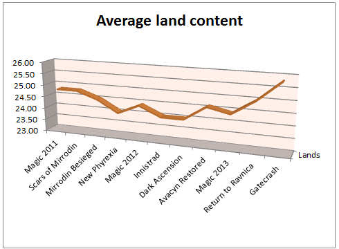 As you can see, the format hasn’t been quite as tightly bound to the 24-card standard as the general impression might indicate, but the adoption of 26 lands as the across-the-board standard for Gatecrash represents a significant increase over sets as recent as Magic 2013. Taken on board with the tick upwards for Return to Ravnica, and this presents something of a concerning trend. Has land filler become the new Core Set filler? It’s a topic we’ll certainly be returning to.