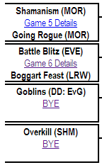 I feel that match 5 is no contest for Going Rogue, since the match was played out before and Going Rogue is one of the best decks this season has. Battle Blitz against Boggart Feast could be more even, but Blitz has more removal and tap tools and Boggart has only a few pieces of removal. Battle Blitz is also strong, it even gave a match to some of my constructed decks as is. A force to be reckoned with.