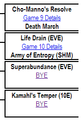 13. Game 9: Cho-Manno’s first strike and flying help it get the win – it looks like it’ll have to win quickly to do it, but I think it may have enough of those keywords to do it before Death March’s big beasties beat it down.