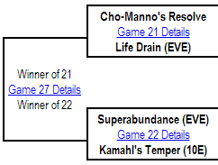 18. Game 21: Life Drain has a superior removal package, with several spells that can eliminate the redoubtable Cho-Manno. It also has direct damage. And a couple of beefy flyers to help compete up above. Cho-Manno still has the advantage of smaller deck = greater consistency, but I think Life Drain takes the win.